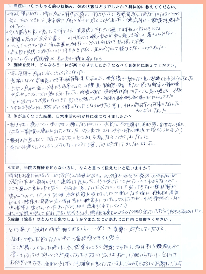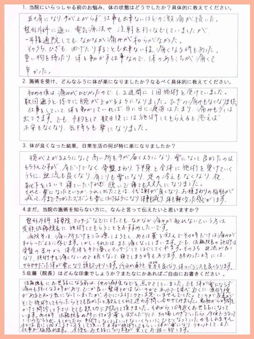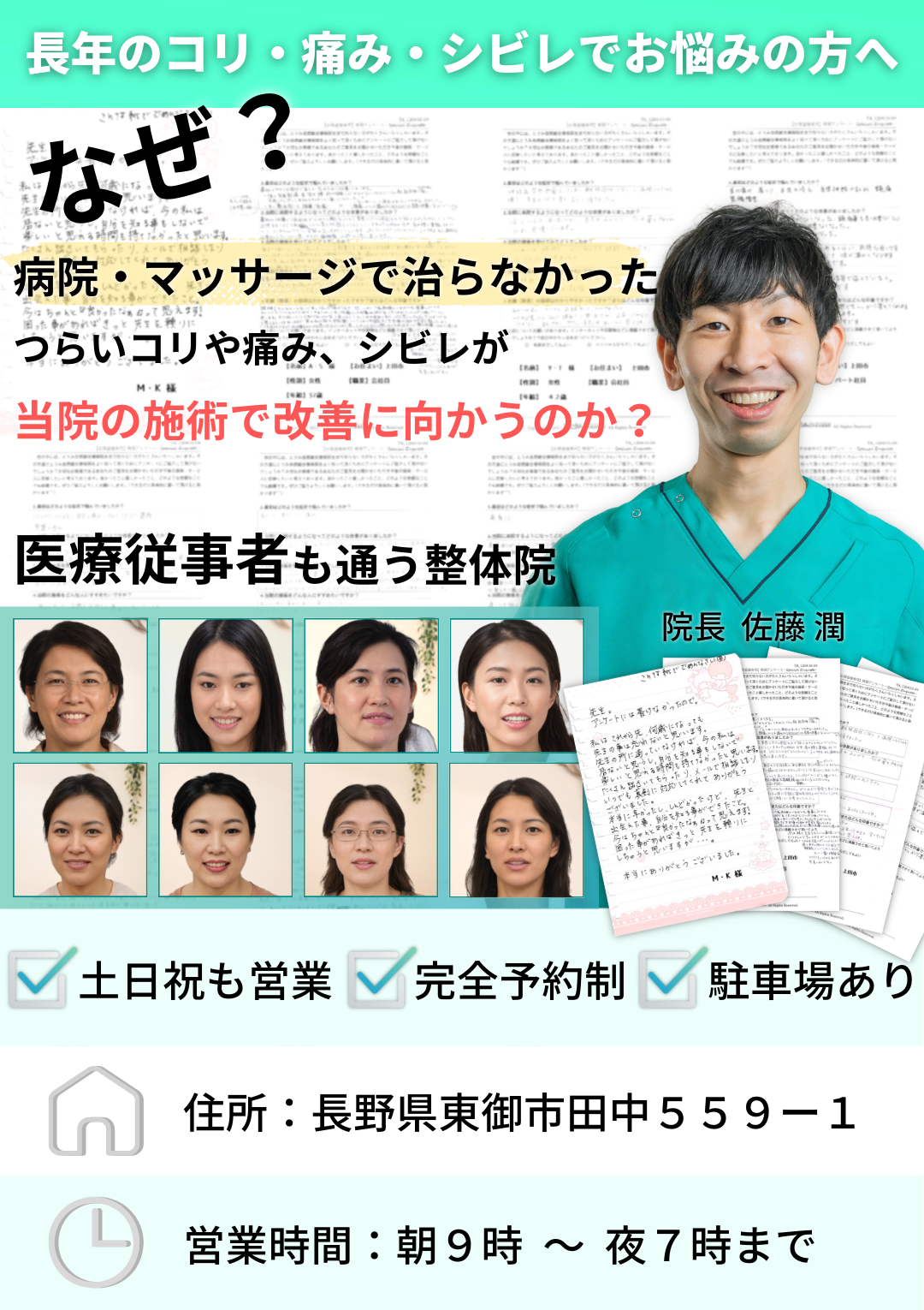 整形外科、接骨院、マッサージなどに行っても、なかなか痛みが取れないという方はぜひ、佐藤院長に施術してもらうことをおすすめしたいです。